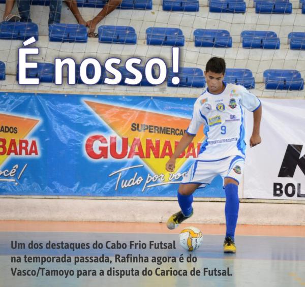 O ala Rafinha é o mais novo reforço do Vasco/Tamoyo para a disputa do Campeonato Carioca de Futsal adulto. O jogador, de 23 anos, estava no Cabo Frio Futsal e foi semifinalista do Campeonato Estadual no ano passado, quando foi eliminado pelo Poker/Petrópolis. Rafinha tem como principais características a velocidade e a marcação.