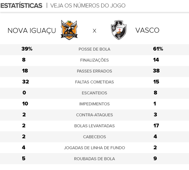 Com o gol no fim do primeiro tempo, o Nova Iguaçu jogou recuado na etapa final e cedeu campo ao Vasco, que terminou o jogo com ampla posse de bola: 61% contra 39%. Porém, o número se refletiu nos passes errados. Foram mais que o dobro de erros do adversário: 38 contra 18. Dakson, com seis passes, e André Ribeiro, foram os que mais falharam no quesito. O time da Baixada Fluminense também abusou das faltas para segurar o placar. Os jogadores pararam o jogo 32 vezes, rendendo seis cartões amarelos.