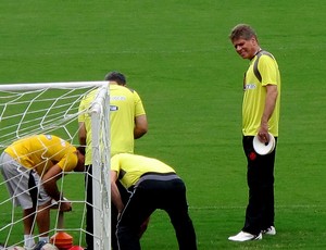 Em campo, o treinador convocou o elenco com palmas. "Vamos, galera", disse ele aos jogadores. Com dois atletas, falou separadamente: Carlos Alberto e Tenorio. É o início da preparação para sua estreia no clube - quarta-feira, contra o Olaria, em Moça Bonita.