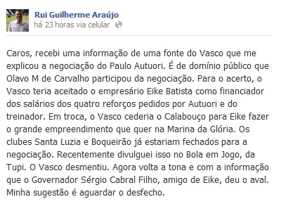 Caros, recebi uma informação de uma fonte do Vasco que me explicou a negociação do Paulo Autuori. É de domínio público que Olavo M de Carvalho participou da negociação. Para o acerto, o Vasco teria aceitado o empresário Eike Batista como financiador dos salários dos quatro reforços pedidos por Autuori e do treinador. Em troca, o Vasco cederia o Calabouço para Eike fazer o grande empreendimento que quer na Marina da Glória. Os clubes Santa Luzia e Boqueirão já estariam fechados para a negociação. Recentemente divulguei isso no Bola em Jogo, da Tupi. O Vasco desmentiu. Agora volta a tona e com a informação que o Governador Sérgio Cabral Filho, amigo de Eike, deu o aval. Minha sugestão é aguardar o desfecho.