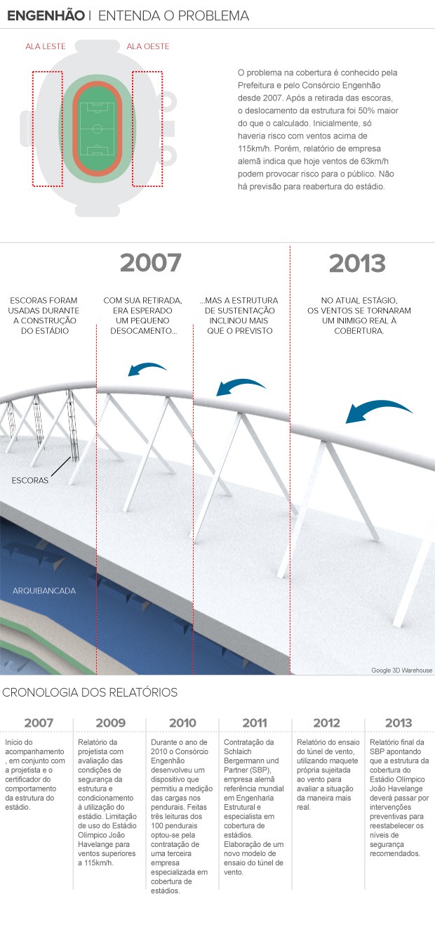 Eu acredito nos meus cálculos e acredito no ensaio que foi feito no Canadá. Segundo esses cálculos, não precisaria ser feito nada, a não ser esse monitoramento que está sendo feito até hoje. Agora, nesse cálculo dos alemães, os níveis de segurança caem mesmo. Ele prevê outro carregamento, outro cenário. Não tenho como dizer qual está certo. Eu confio no cálculo que foi feito no Canadá. Os alemães confiam no deles. Diante do que ele recebeu, o prefeito deve tomar a posição adequada. Mas eu levaria a minha família tranquilamente para assistir a um jogo. No cálculo dos alemães, os níveis de segurança diminuem, mas não haveria colapso. Ou seja, a cobertura não corre risco de cair nem há risco para as pessoas. Não dá para dizer qual velocidade de vento provocaria isso, porque é tudo teórico. O ideal seria fazer medições no local.