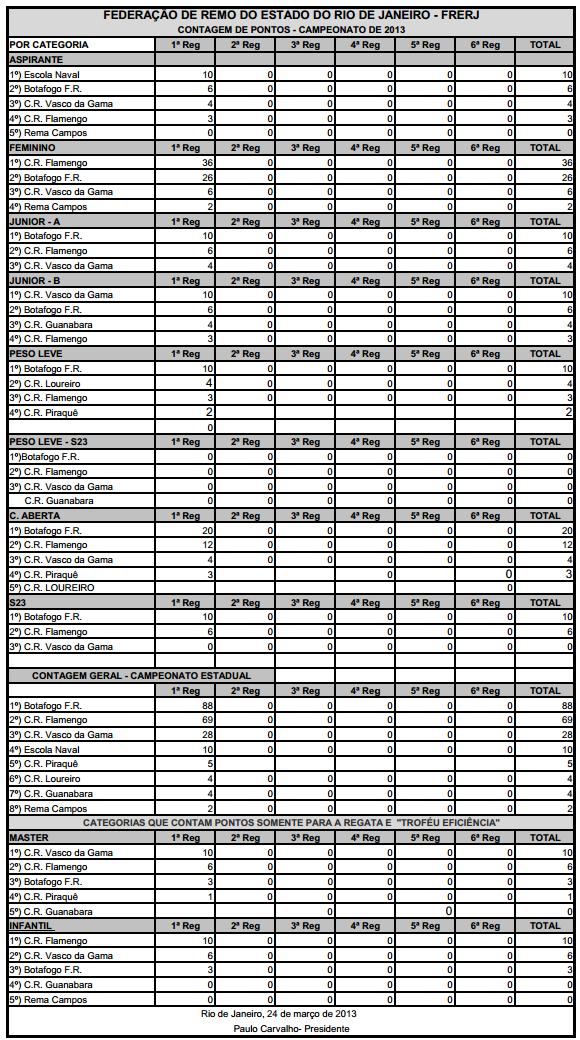 Foi aprovada, pela Comissão de Arbitragem, a 1ª REGATA DO CAMPEONATO ESTADUAL, realizada no dia 24 de março de 2013, na Lagoa Rodrigo de Freitas cujo o resultado foi o seguinte: