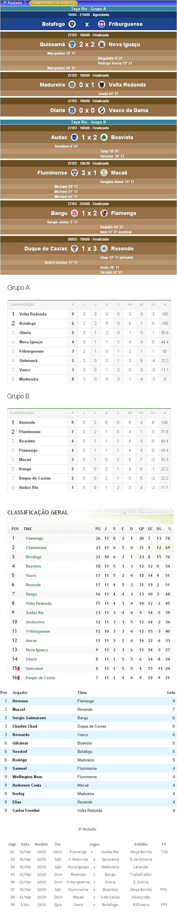 Faltando 1 jogo (Botafogo x Friburguense, adiado para 10/04) para o fim da 3ª rodada da Taça Rio (2º turno do Estadual), o Vasco, que empatou com o Olaria por 0 a 0, subiu da 8ª e última para a 7ª e penúltima posição no Grupo A.