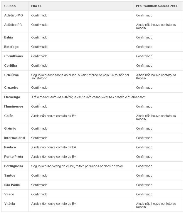 PES 2014 e Fifa 14 ainda nem foram apresentados oficialmente e as suas produtoras já iniciaram as negociações para licenciar os principais clubes brasileiros em seus futuros jogos. Enquanto a Konami possui um contrato com a maioria dos times até o ano que vem, a Eletronic Arts corre para liberar times que em Fifa 13 não estavam presentes oficialmente.