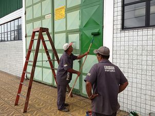 Do lado de fora, uma equipe percorre pelas entradas do Estádio da Cidadania para pintar partes já desbotadas. O rastro dos pintores pode ser visto pela tinta fresca nos portões.