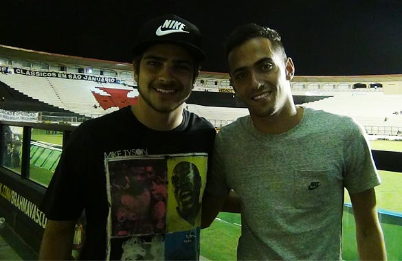 Muito amigo do meia Bernardo, o ator da Rede Globo e cantor da banda Noizz, Bernardo Mesquita prestigiou o camisa 31 do Vasco no jogo contra o Frigurguense deste domingo (07/04), em São Januário.