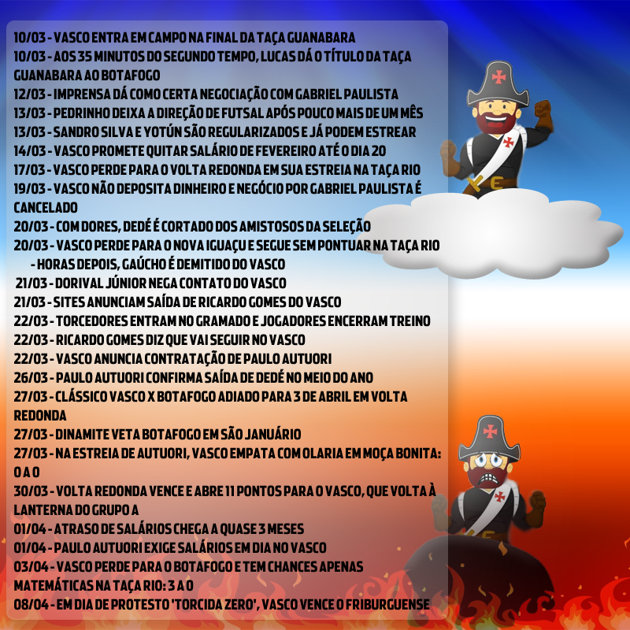 Em seguida, foi a vez de Pedrinho, ídolo da torcida, abandonar o barco, deixando a direção de futsal do clube. Quando a crise dentro das quatro linhas surge, os problemas extracampo não demoram a aparecer e, na mesma semana, a falta de pagamentos voltou a ser notícia no Vasco. Dias depois, foi a vez dos torcedores mostrarem insatisfação e invadirem o treino, obrigando os jogadores a encerrarem a atividade. Foram tantas tempestades que a nau cruzmaltina enfrentou que até o ídolo Edmundo pediu ajuda.