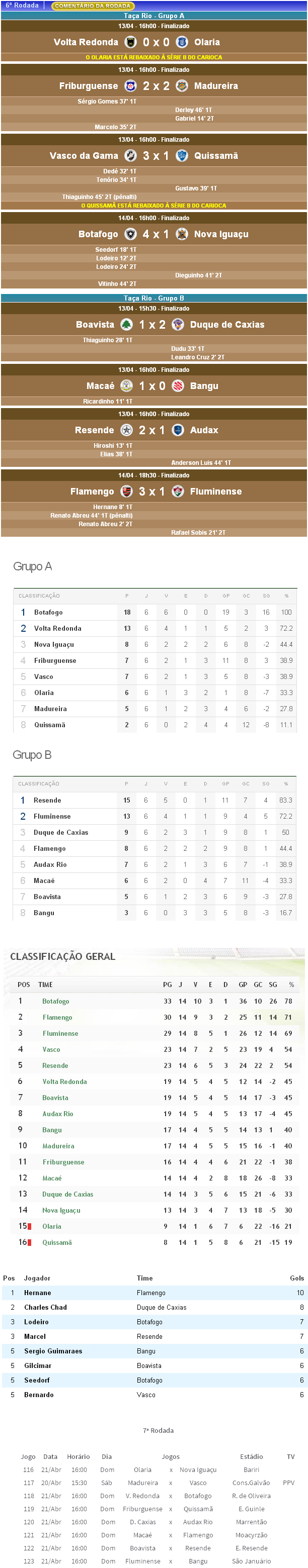 Os semifinalistas da Taça Rio já estão definidos: Botafogo e Volta Redonda pelo Grupo A e Resende e Fluminense pelo Grupo B. Os rebaixados para a Série B de 2014 também já são conhecidos: Olaria e Quissamã.