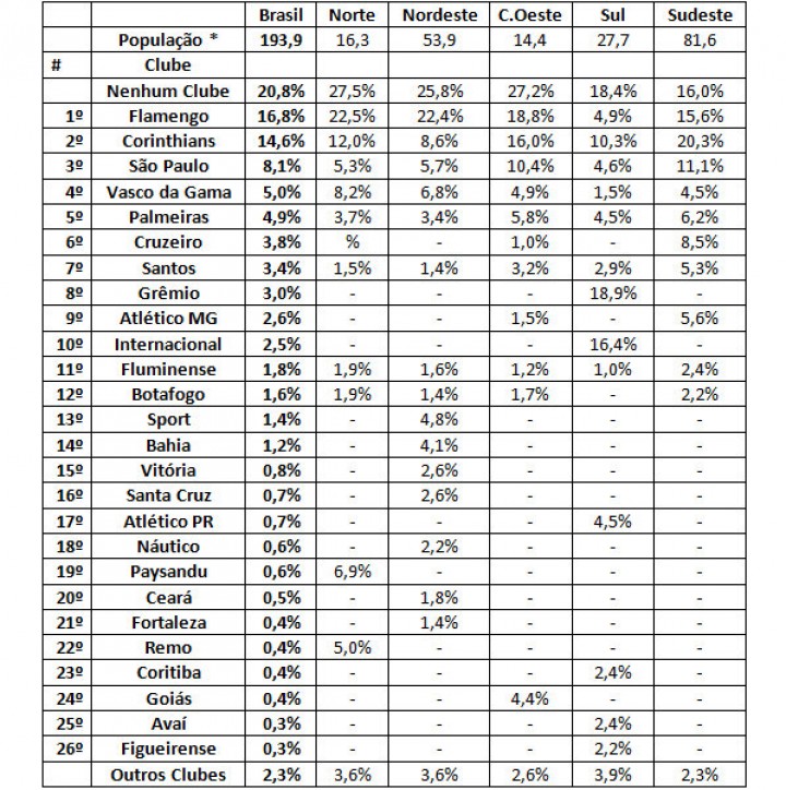 O quadro abaixo é somente uma compilação do que já foi publicado, permitindo uma visão total das torcidas no Brasil, por regiões.