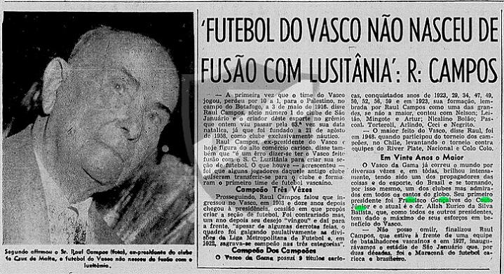 Em depoimento inédito ao jornal "A Noite", publicado em 22 de agosto de 1963, Raul Campos, sócio número 1 do Vasco, ex-presidente que inaugurou o estádio de São Januário, relembrava que fora ele o criador do departamento de futebol do Clube, cujo time entrou em campo pela primeira vez em 3 de maio de 1916, e ainda revelou que "é um erro dizer-se ter o Vasco feito fusão com S. C. Luzitânia para criar sua seção de futebol. O que houve - acrescentou - foi que alguns jogadores daquele antigo clube quiseram transferir-se para o clube e formaram o primeiro time de futebol vascaíno".