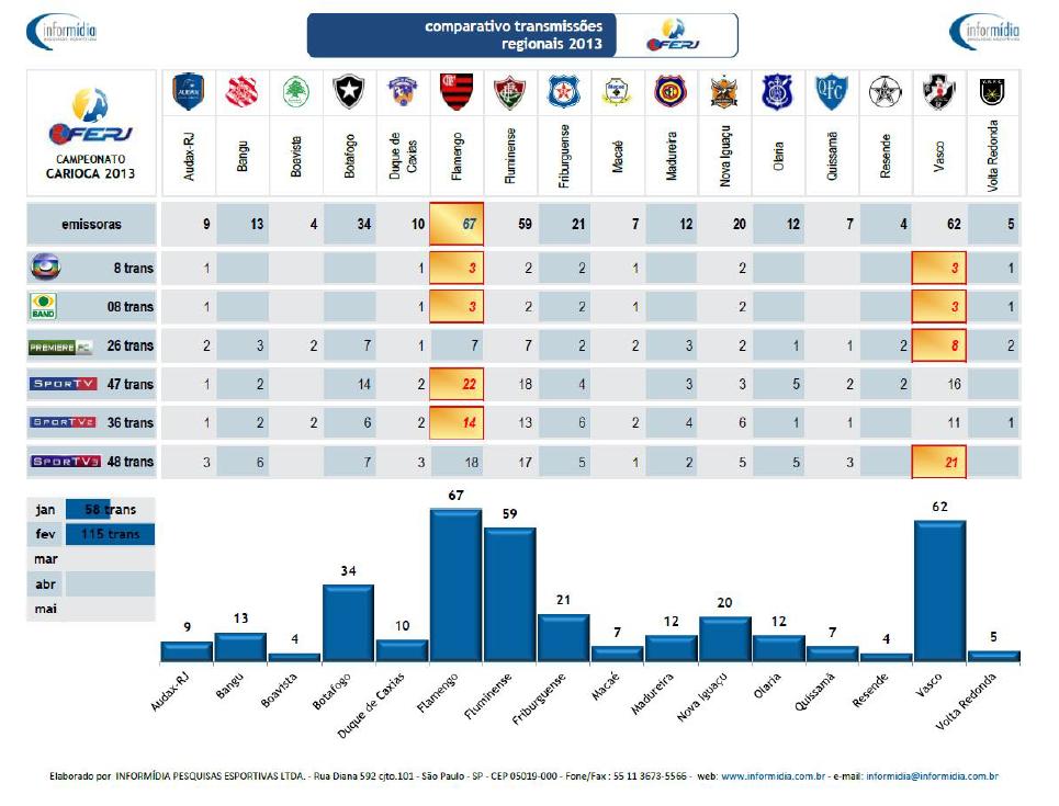 A Informídia Pesquisas Esportivas acaba de elaborar importante estudo mensurando a visibilidade dos clubes brasileiros nos dois primeiros meses dos estaduais de São Paulo, Rio, Minas e Rio Grande do Sul. A publicação é uma exclusividade do Blog Teoria dos Jogos: