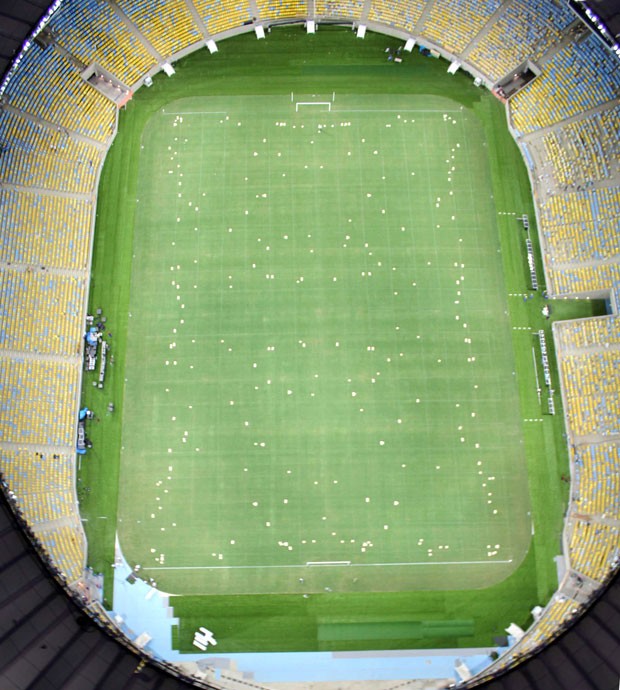 O palco das finais da Copa das Confederações e da Copa do Mundo começou a ganhar forma na noite desta quarta-feira. A Greenleaf, empresa responsável pelo gramado do Maracanã, iniciou a marcação do campo de jogo, mas o trabalho só será concluído na sexta, véspera do primeiro evento-teste no estádio.