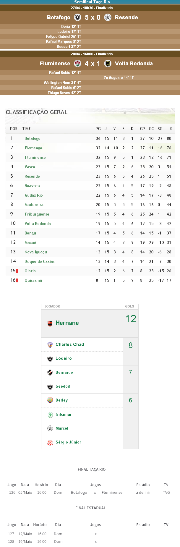 Com Botafogo e Fluminense classificados à decisão da Taça Rio, e a consequente eliminação de Resende e Volta Redonda, a colocação final do Vasco no Campeonato Estadual 2013 está definida: 4º lugar.