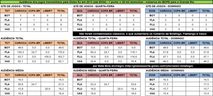 O blogueiro ainda demonstra que, pelo fato de só ter sido exibido aos domingos, o Botafogo se sai bem, com audiências inferiores apenas às do Flamengo no Estadual. E reforça a necessidade visceral do Glorioso voltar a participar da Copa Libertadores – competição com maior apelo, audiências e principalmente valorização da marca.