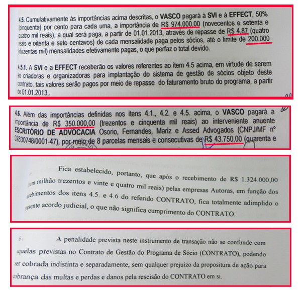 A versão de Eduardo Machado é sustentada pelos atuais dirigentes do clube. Eles argumentam que a assinatura do novo contrato com a SVI e Effect não guarda qualquer relação com a multa acordada em juízo. Segundo os documentos do processo, que está na 12ª Vara Cível do TJ, a extinção da ação de cobrança de multa pela rescisão contratual de 2009 - com o consequente pagamento de R$ 1,324 milhão do Vasco às empresas credoras - foi assinada no mesmo dia 22 de novembro do novo contrato entre o clube e as empresas do programa de sócios.