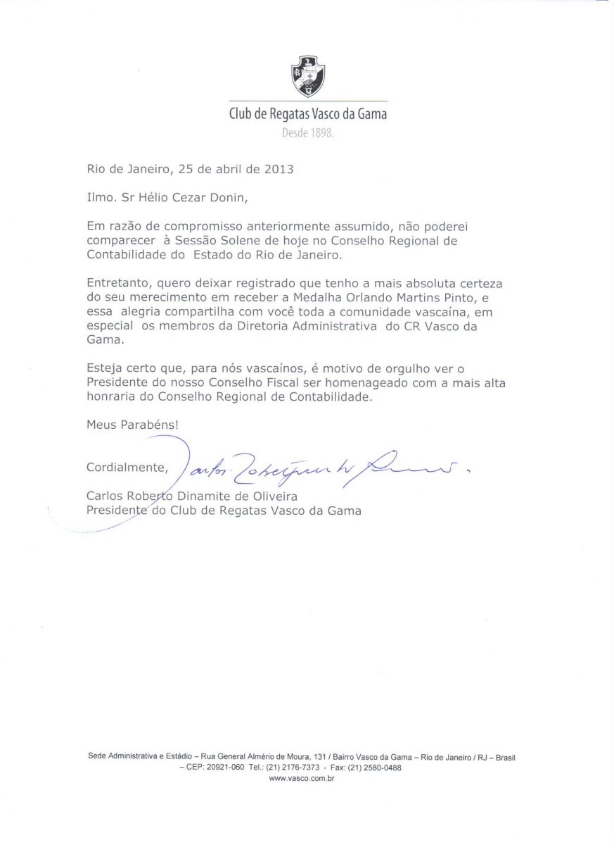 O presidente do Conselho Fiscal do Vasco, Helio Cezar Donin, foi homenageado pelo Conselho Regional de Contabilidade do Rio de Janeiro, na noite da última quinta-feira (25/04), no Auditório Mario Lorenzo Fernandes, no Centro do Rio de Janeiro. Em homenagem ao Dia da Contabilidade, o vascaíno recebeu a medalha Orlando Martins Pinto, a mais valiosa honraria da classe contábil.