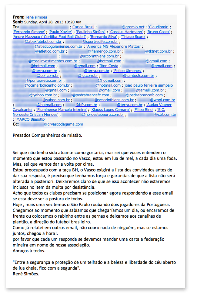 No e-mail escrito aos demais dirigentes no final de semana, René Simões chega, inclusive, a se desculpar pela ausência nas discussões, culpando os problemas enfrentados desde a sua chegada em São Januário.