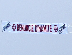 Na rua General Almério de Moura, bem em frente à entrada principal de São Januário, um bar sintetiza sutilmente o atual momento. Acima da entrada de um dos banheiros, um pequeno adesivo chama a atenção: “Operação Renuncie, Dinamite. Eu apoio.” Essa citação, coberta de um logotipo alusivo ao da Lei Seca, cresceu. Contra o Friburguense, ganhou proporções maiores após o gol de empate dos visitantes - o Vasco venceu por 2 a 1. O apelo virou uma faixa. Ele, que levava milhares, viu cerca de 250 torcedores se recusarem a entrar no estádio. Até tablet um vascaíno usou para passar sua mensagem em frente à câmera da TV.