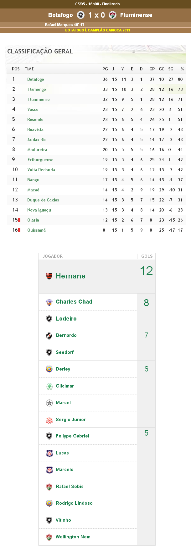 O Botafogo venceu o Fluminense por 1 a 0 na decisão da Taça Rio, conquistando o troféu que equivale ao 2º turno do Estadual. Como já havia conquistado a Taça Guanabara, que equivale ao 1º turno, o Alvinegro se sagrou campeão estadual de 2013 sem a necessidade de uma decisão. O Flamengo foi o vice-campeão, o Fluminense foi o 3º colocado e o Vasco ficou na 4ª posição. Olaria (15º colocado) e Quissamã (16º) foram os clubes rebaixados. A classificação geral (pontos ganhos na Taça GB+Taça Rio, excluídas semifinais e finais) abaixo é o critério oficial previsto pelo regulamento para definição do 2º ao 16º colocados.