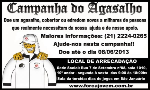 O G.R.T.O. Força Jovem do Vasco vem por meio de sua Diretoria solicitar a colaboração de todos os seus associados e componentes para poderem levar um agasalho, cobertor ou edredom a milhares de pessoas que realmente necessitam da nossa ajuda e de nosso apoio.