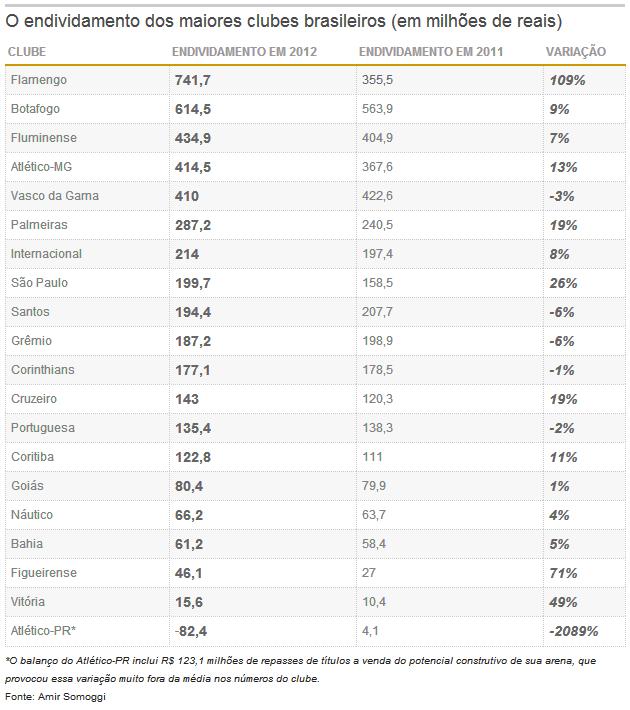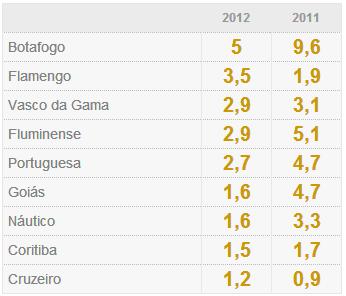 Outro aspecto positivo revelado pelos números reunidos no estudo é a redução da relação entre dívida e receita total dos clubes (na tabela ao lado). Com o incremento das receitas obtidas pelas equipes, o indicador melhorou. Quanto menor ele for, mais positiva é a situação. A relação entre dívida e receita total média dos vinte clubes avaliados por Somoggi era de 1,78 em 2011. No ano passado, ela caiu para 1,44. O Botafogo ainda é o clube cuja dívida é mais distante de seu faturamento anual, mas o abismo ficou menor em 2012. Em 2011, a dívida do clube alvinegro era quase dez vezes maior que a receita total do clube carioca na temporada. Em 2012, a dívida estava cinco vezes maior que o faturamento. Depois do Botafogo aparecem os outros três grandes do Rio: Flamengo, Vasco e Fluminense. Por causa de suas enormes receitas (é o líder nesse quesito) e de uma gestão financeira mais profissional do que na década passada, quando viveu fortes turbulências, o Corinthians tem uma relação dívida/receita total de apenas 0,5. O São Paulo, vice-campeão em receitas em 2012, aumentou sua dívida, mas mesmo assim está numa situação mais confortável que os grandes do Rio, por exemplo. Suas dívidas correspondiam a 70% de sua receita total anual na última temporada.