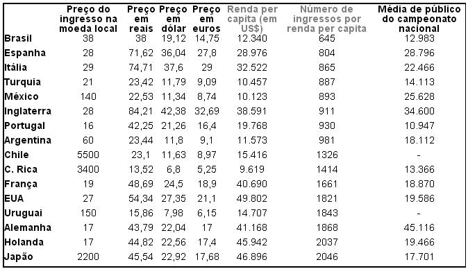 A medição foi feita levando em conta a renda per capita de 16 países e dividindo os respectivos valores pelo preço médio dos ingressos aplicados em cada campeonato nacional. O resultado é que a renda por cada brasileiro pode comprar 645 ingressos por ano.