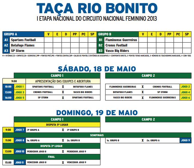 Nessa primeira etapa, seis times jogarão no Rio Bonito Atlético Clube: Botafogo Flames (RJ), Cronos Football (SP), Fluminense Guerreiras (RJ), São Paulo Storm (SP), Spartans Football (SP) e Vasco Big Riders (RJ).