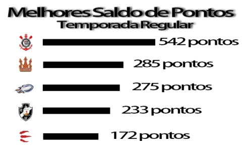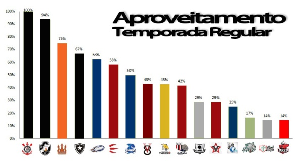 Neste gráfico de aproveitamento da temporada regular não estão as equipes que entraram este ano: Juventude Gladiators, Flamengo F.A, Salvador All Saints e Minas Locomotiva.