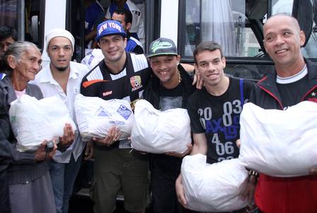 Belo e Kleber Bambam passaram a tarde desta sexta-feira chuvosa entregando alimentos na comunidade de Pilar, em Duque de Caxias, no Rio. A boa ação contou com a ajuda do MC Serginho e o jogador do Vasco Marquinhos.