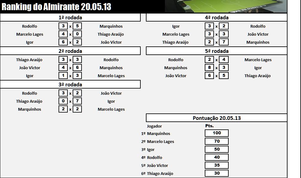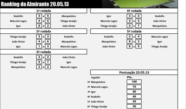 Foi realizado na noite desta segunda-feira (20/05) na Divisão de Futebol de Mesa do C.R. Vasco da Gama a disputa do segundo torneio correspondente ao mês de Maio do Ranking do Almirante 2013 para a modalidade Bola 12 Toques.