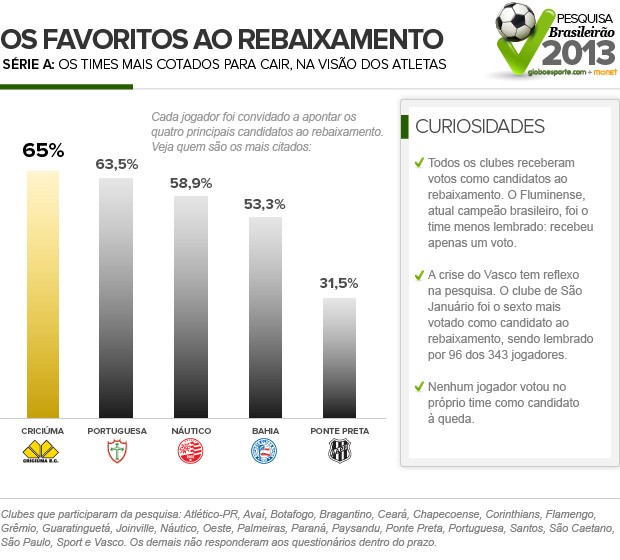 Cada jogador foi convidado, em questionário, a apontar os quatro times que têm mais chances de queda, na visão deles. O Tigre foi citado por 223 dos 343 jogadores. Ou seja: uma fatia de 65% deles colocou o clube catarinense como um dos rebaixados. Na sequência, aparecem Portuguesa (218), Náutico (202), Bahia (183) e Ponte Preta (108).