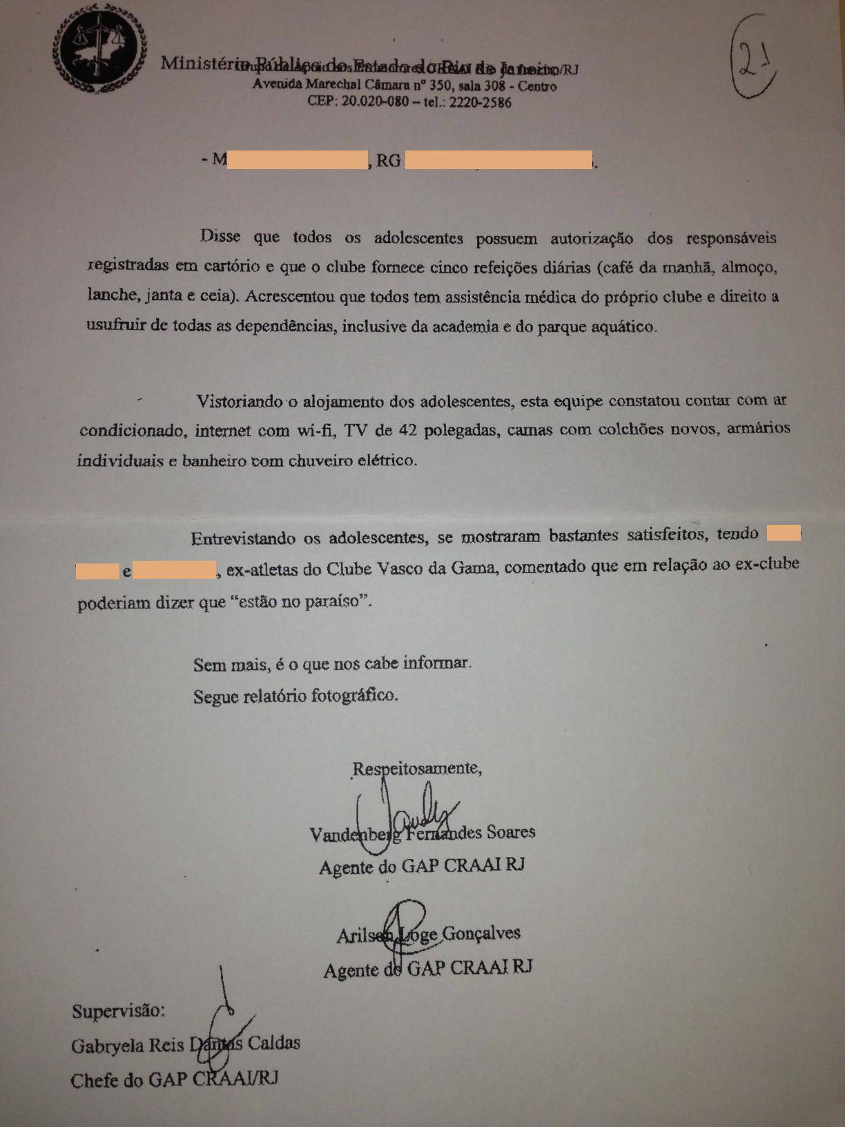 O Ministério Público teve uma boa supresa após visitar as instalações da base do Olaria: da internet ao chuveiro elétrico, tudo funcionava. Duro foi o relato de três jogadores oriundos do Vasco. Admitiram que, em comparação com o que haviam vivido no ex-clube, consideravam-se no paraíso.