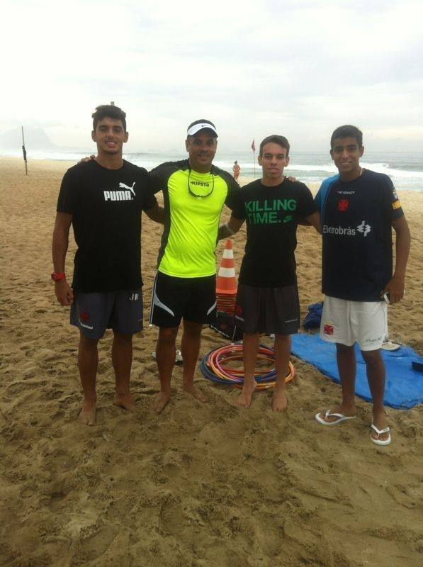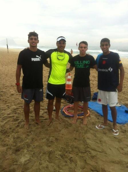 Marcos Do Sul: Treino hoje na praia da Barra, com meu preparador físico Marcelo Bráz, e na companhia dos parças, o zagueiro capitão Linderman, e do lateral direito Lucas Alves, do sub-17!