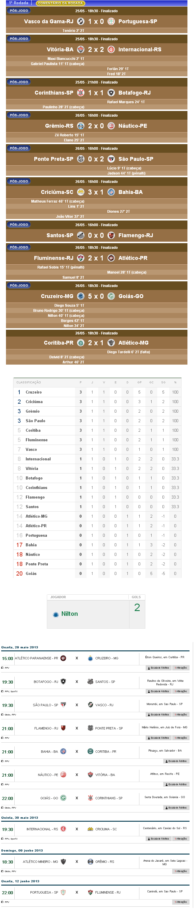 Terminada a 1ª rodada do Campeonato Brasileiro 2013, o Vasco, que derrotou a Portuguesa por 1 a 0, está na 7ª colocação na tabela, empatado em nº de pontos com o líder Cruzeiro.