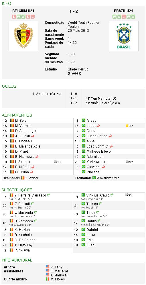 A estreia da Seleção Brasileira Sub-20 no Torneio Internacional de Toulon, na França, nesta quarta-feira, foi com vitória. O Brasil derrotou a Bélgica por 2 a 1, com gols de Yuri Mamote e Vinícius Araújo.