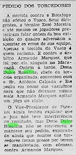 Ontem a tarde, Dona Dulce Rosalina, Chefe da Torcida Organizada, conversou com o Senhor Antônio Calçada e lhe pediu em nome dos Vascaínos para que não deixasse nunca mais Armando Marques apitar um jogo do Clube.