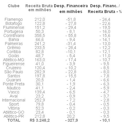 No topo do ranking está o Flamengo. A despesa financeira líquida do Rubro-Negro carioca - em torno de R$ 51,8 milhões - equivale a 24,4% da receita bruta de R$ 212 milhões. O número é justificado pela ação da nova diretoria do clube, que adotou a filsoofia de corrigir todos os passivos que não vinham sendo registrado adequadamente pela antiga gestão.