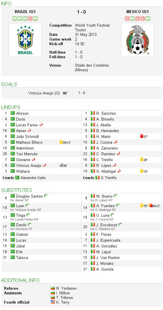 No primeiro tempo, o Brasil teve mais posse de bola mas não conseguia furar o ferrolho mexicano, até os 36 minutos de jogo, quando Vinícius marcou o único gol do encontro.