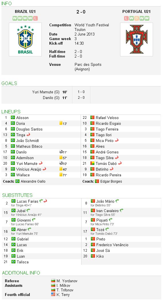 O Brasil deu um passo importante rumo à final do torneio de Toulon ao derrotar neste domingo a seleção de Portugal por 2 a 0, liderando o Grupo B da competição com nove pontos em três partidas.