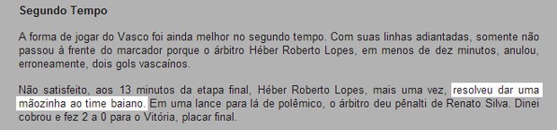 "Não satisfeito (em anular dois gols), aos 13 minutos da etapa final, Héber Roberto Lopes, mais uma vez, resolveu dar uma mãozinha ao time baiano", descreveu o texto do site vascaíno, que considerou o comportamento do time em campo "um pouco superior ao apresentado no segundo tempo da partida contra o São Paulo".