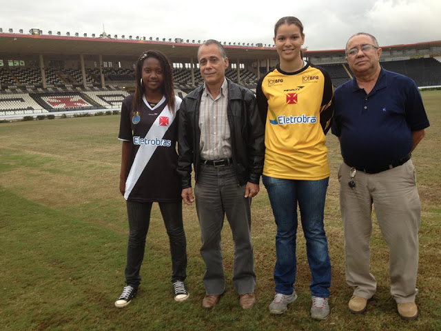 Na foto, as duas atletas dividem a alegria da convocação com os Diretores de Futebol Feminino Ademir Antunes e Tadeu Correia, este último também Vice-Presidente de Infanto Juvenil.