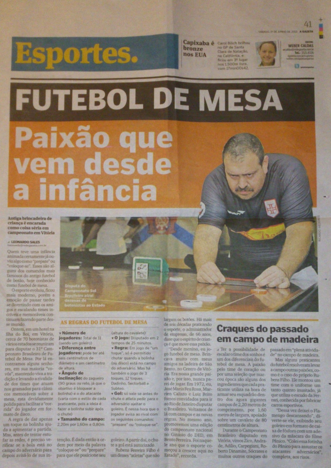 Nota: O atleta vascaíno Weber Gomes estampou a capa do caderno de esportes do jornal A GAZETA.