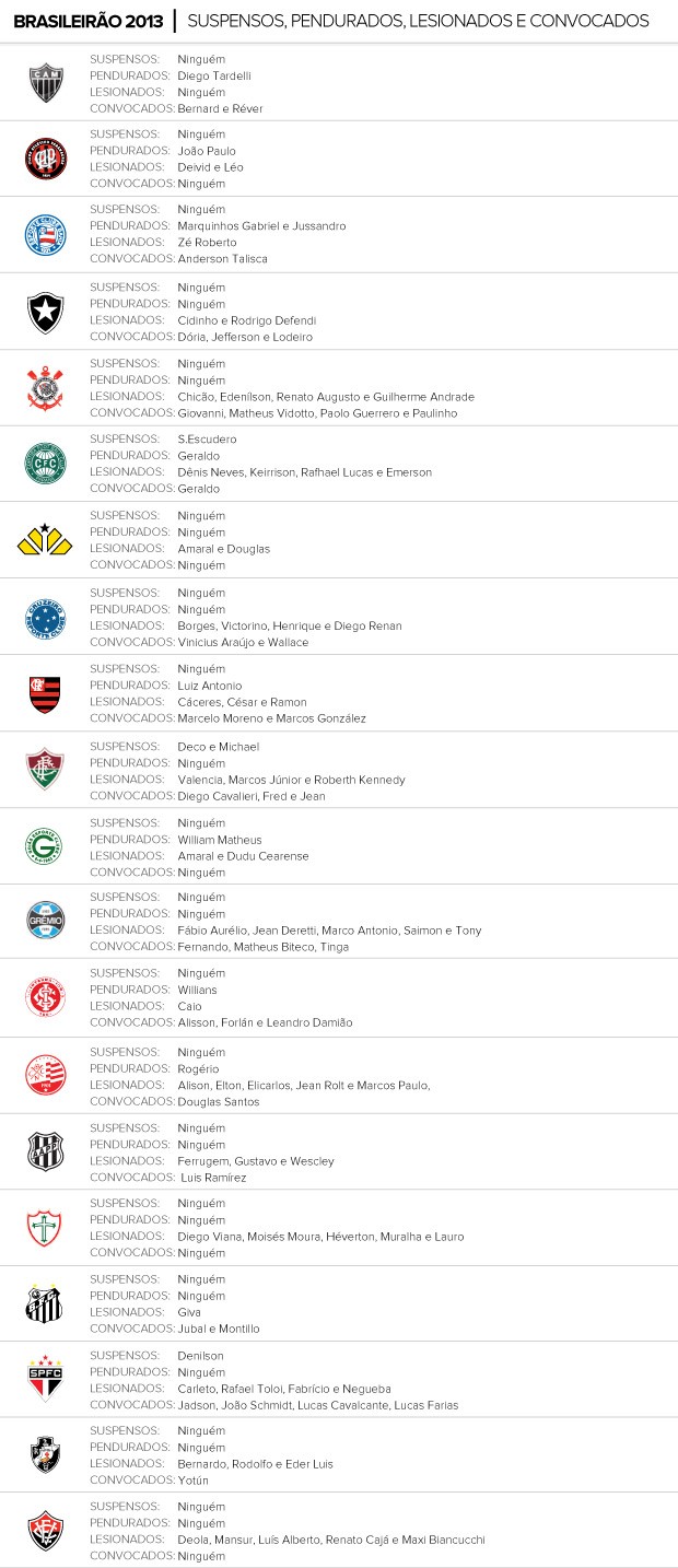 O mesmo vale para o Botafogo: terceiro na classificação, enfrenta o décimo colocado Bahia, que também como visitante surpreendeu o Internacional na rodada passada. A equipe carioca não pode contar com Jefferson, na seleção principal, Dória, na Sub-20, e Lodeiro, artilheiro da rodada passada que se apresentou à seleção uruguaia.