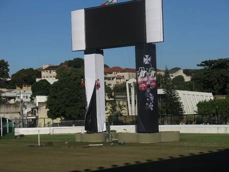 Quem for a São Januário assistir ao amistoso entre italianos e haitianos perceberá algumas diferenças claras no estádio. Nesta terça-feira, um grupo equipado com ferramentas de alpinismo cobria com plástico branco a publicidade da cervejaria responsável pela construção do novo placar eletrônico da Colina, instalado no começo do ano passado. O mesmo tem sido feito em outras partes do estádio e também na antiga publicidade da Eletrobras, já que a Fifa não permite a exposição de marcas que não sejam as oficiais da entidade.