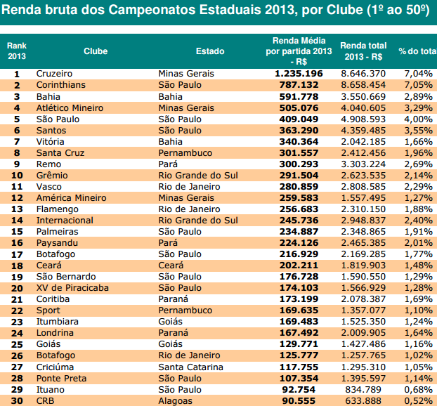 A concentração é grande, o que ilustra a disparidade de força entre os clubes que disputam os Estaduais. A arrecadação do Corinthians (1º do ranking de receita total) equivale à soma da renda dos últimos 160 clubes do ranking total, que conta com 278 equipes;