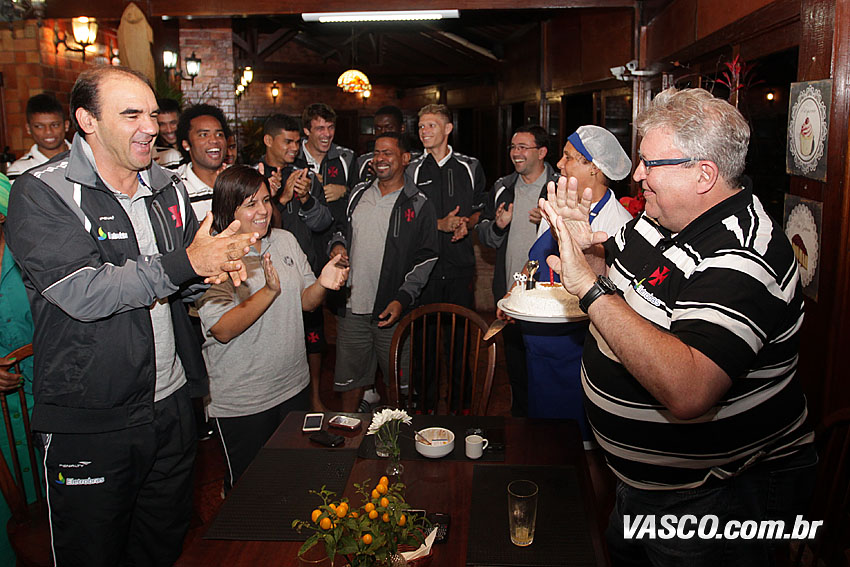 O elenco vascaíno comemorou o aniversário do doutor Clóviz Munhoz, após o jantar desta sexta-feira (07/06), em Pinheral. O doutor do Vasco completou 63 anos de idade na última quinta-feira (06) e ganhou uma festa surpresa nesta sexta dos companheiros de viagem. Todos os membros da comissão técnica e jogadores participaram do parabéns.