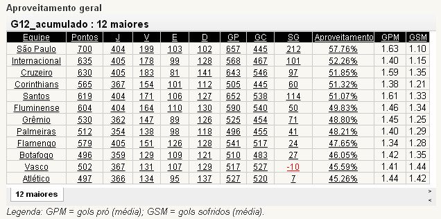 Campanhas em números absolutos e aproveitamentos (percentuais) dos 12 maiores clubes do Brasil, considerando-se todas as edições de campeonatos brasileiros de pontos corridos até a atual: