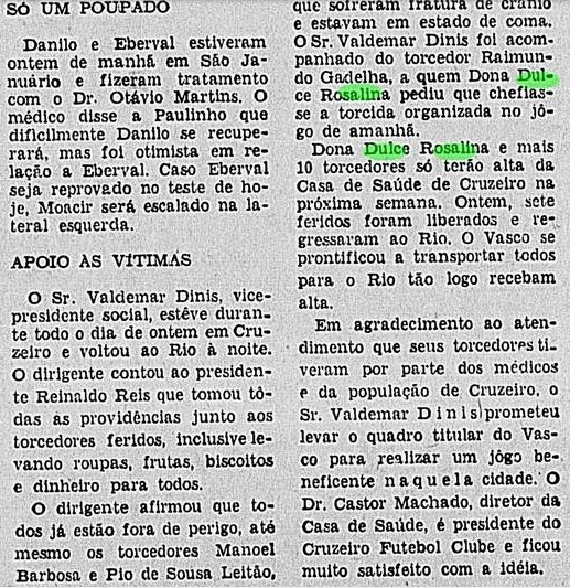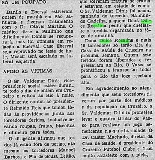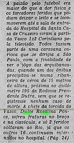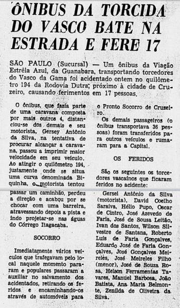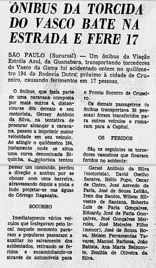 Todos faziam parte de uma caravana carioca que se dirigia a São Paulo, coma finalidade de ver o jogo das arquibancadas, quando um dos ônibus precipitou-se numa ribanceira de cerca de 15 metros de altura, próxima ao quilômetro 195 da Rodovia Presidente Dutra, sem que se registrasse nenhum caso de morte.