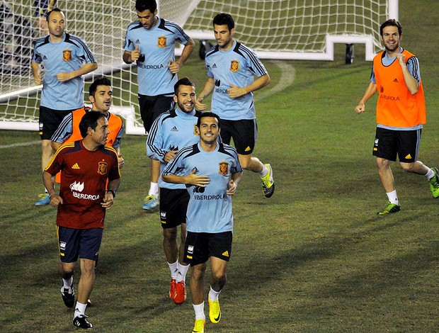 Antes de treinar com bola por cerca de 20 minutos, Del Bosque e sua comissão técnica promoveram brincadeiras no aquecimento. Primeiro, uma espécie de “vivo ou morto”, quando o último a cair no chão após um pique pagava algumas flexões. Depois, numa atividade técnica, a tradicional roda de bobo, promovendo passes rápidos que a Espanha acostumou o seu espectador em jogos.