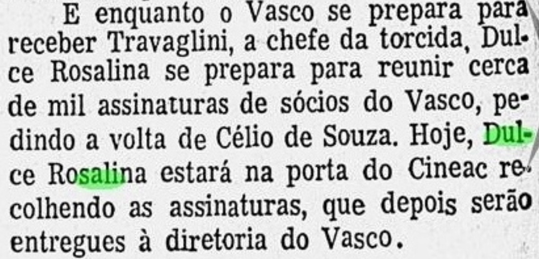 E enquanto o Vasco se prepara para receber o Técnico Travaglini, a Chefe da Torcida Organizada, Dulce Rosalina se prepara para reunir cerca de de 1000 assinaturas de Sócios do Vasco, pedindo a volta de Célio de Souza.
